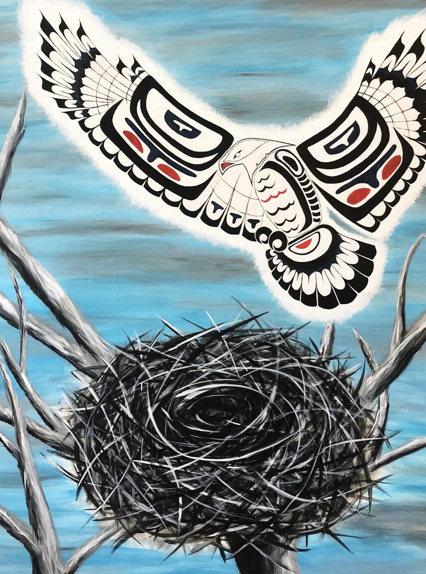 Since 2018, the Lex̱éywa exhibit has travelled throughout the community, supporting education through the arts. The art pieces and audio were also produced into a book titled “Lex̱éywa: I Pass the Torch to You” by Bea Silver, which can be found in the Ray & Mille Silver Library at the Mamele’awt Indigenous Centre.